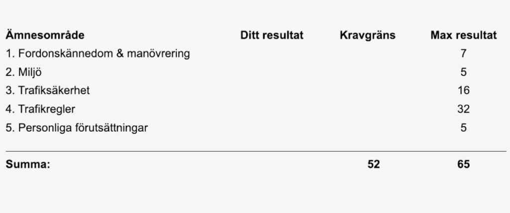 Иймээс та ямар асуултад буруу хариулснаа мэдэхгүй тул шалгалтын үр дүнгийн тайланг (resultatbesked) ашиглан сайжруулах шаардлагатай сэдвүүдээ тодорхойлж, судалгаагаа үргэлжлүүлэх нь зүйтэй. Мөн жолооны сургууль (trafikskola)-аасаа нэмэлт зөвлөгөө, тусламж авахыг зөвлөе.